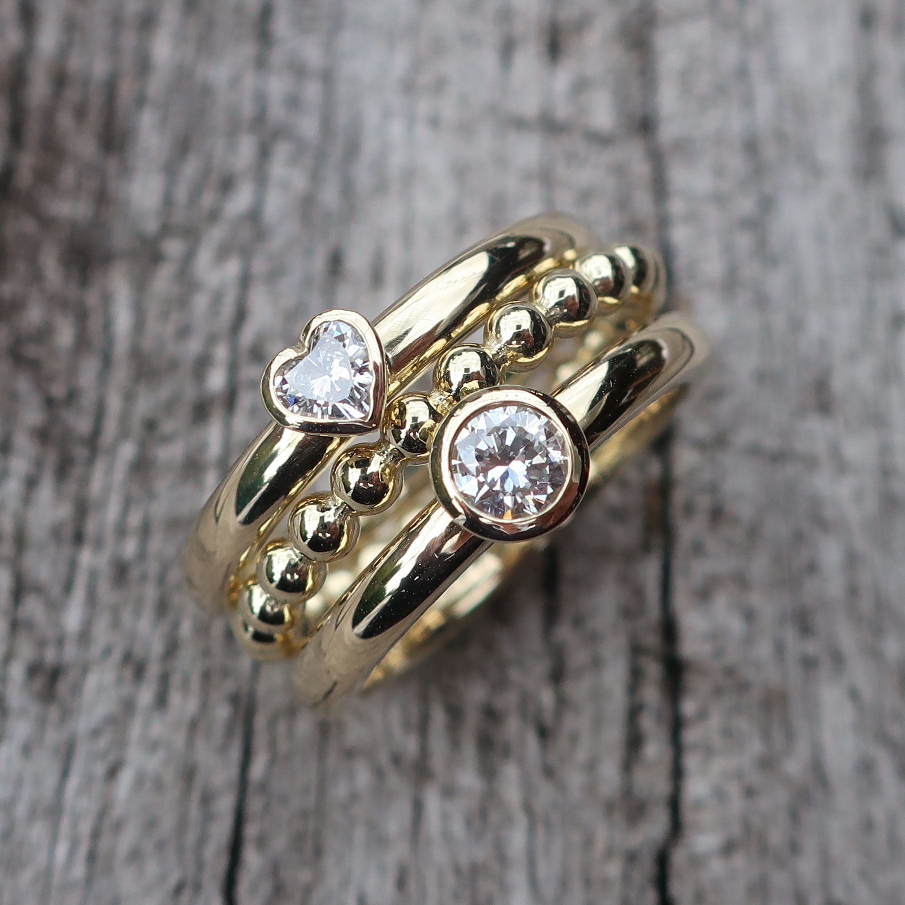 Ein Set bestehend aus 3 einzelnen Goldringen, einem Kugelring, 2 Ringe Ring mit einem Herz Diamanten, und Brillant, jeweils ein Viertelkaräter.