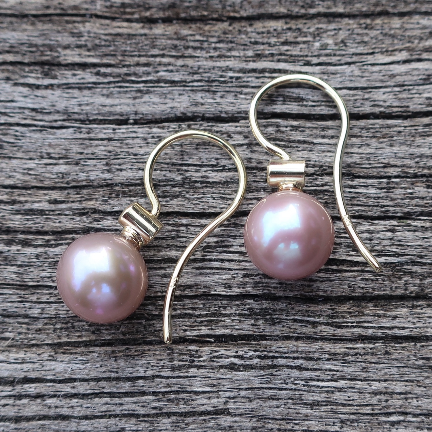 Ein Paar goldene Ohrhänger, bestehend aus 585 Gold mit naturfarbenen Lavendel Perlen und Brillanten.